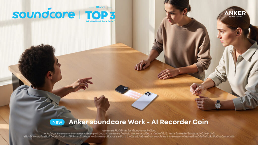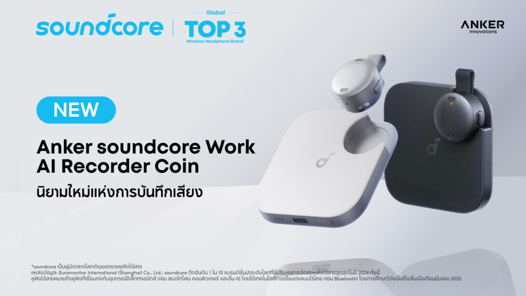 กรุงเทพฯ – 23 กุมภาพันธ์ 2569 – soundcore ประกาศเปิดตัวนวัตกรรมล่าสุด Anker soundcore Work – AI Recorder Coin ในประเทศไทยอย่างเป็นทางการวันนี้ ถือเป็นก้าวสำคัญของการพัฒนาเทคโนโลยีอัจฉริยะจากทางแบรนด์ soundcore พร้อมตอกย้ำความมุ่งมั่นในการสนับสนุนกลุ่มคนทำงานระดับมืออาชีพและเหล่าครีเอเตอร์ ด้วยนวัตกรรมที่ช่วยเพิ่มประสิทธิภาพการทำงานให้คล่องตัวและชาญฉลาดยิ่งกว่าเดิม