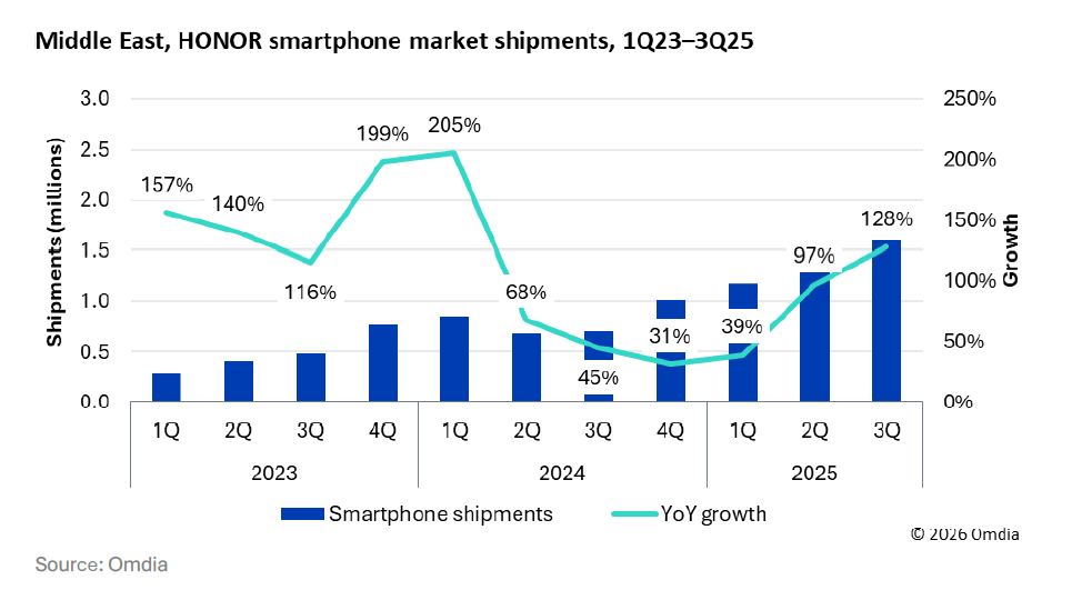 HONOR ยกระดับการดำเนินธุรกิจในตลาดโลกสู่การเป็นเสาหลักสำคัญในการสร้างการเติบโตอย่างเต็มตัว โดยได้รับแรงหนุนจากยอดจัดส่งสมาร์ทโฟนที่เพิ่มขึ้นอย่างแข็งแกร่ง พร้อมการปรับพอร์ตโฟลิโอที่มุ่งเน้นผลิตภัณฑ์ระดับกลางถึงไฮเอนด์ (Mid-to-High-end) และการวางกลยุทธ์จำแนกตามพื้นที่ ทั้งในตลาดยุโรป, ละตินอเมริกา, ตะวันออกกลางและแอฟริกา รวมถึงเอเชียตะวันออกเฉียงใต้ อย่างไรก็ตาม ความท้าทายสำคัญในการรักษาความต่อเนื่องของแรงส่งนี้ ขึ้นอยู่กับความสามารถในการบริหารจัดการความเสี่ยงด้านซัพพลายเชน การยกระดับการดำเนินงานในระดับท้องถิ่นให้ลึกซึ้งยิ่งขึ้น รวมถึงการต่อยอดสร้างรายได้จากบริการที่ขับเคลื่อนด้วยนวัตกรรม AI นอกเหนือจากการจำหน่ายฮาร์ดแวร์เพียงอย่างเดียว