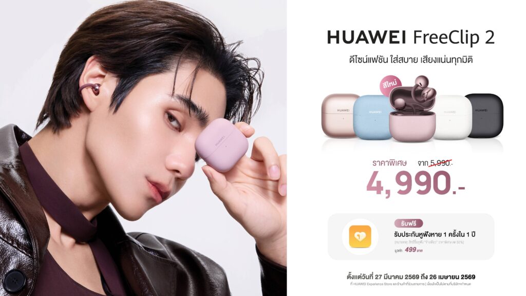 HUAWEI FreeClip 2 สีใหม่วางจำหน่ายแล้ววันนี้ สีม่วง Berry Purple และสีฟ้า สีดำ สีขาว และสีโรสโกลด์ พิเศษช่วงเดือนแรกที่วางจำหน่าย เป็นเจ้าของได้ในราคาเพียง 4,990 บาท (จากราคาปกติ 5,990 บาท) เมื่อซื้อระหว่างวันที่ 4 เมษายน 2569 – 4 พฤษภาคม 2569 พร้อมรับฟรี HUAWEI 1 Year Loss Care Warranty มูลค่า 499 บาท (รับประกันหูฟังหาย 1 ข้าง สามารถซื้อข้างเดียวได้ในราคาลด 50% เคลมได้ 1 ครั้งใน 1 ปี) สามารถสั่งซื้อได้ที่หน้าร้าน HUAWEI Experience Store และร้านค้าตัวแทนจำหน่ายที่ร่วมรายการ รวมถึงช่องทางออนไลน์บน HUAWEI Store, Lazada, Shopee และ TikTok Shop