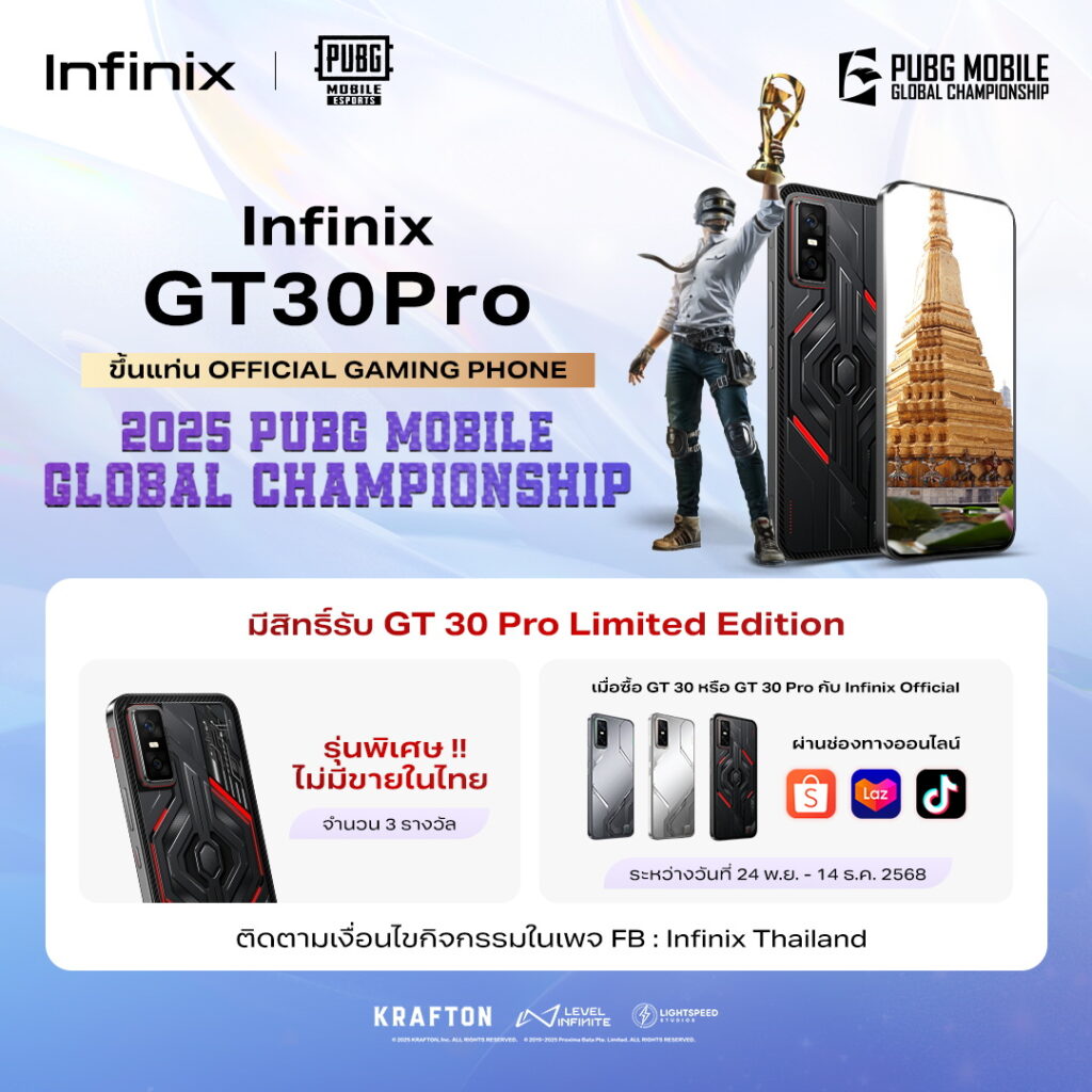 กรุงเทพฯ 12 ธันวาคม 2568 – อินฟินิกซ์ (Infinix) แบรนด์สมาร์ทโฟนระดับโลกที่คุ้มค่า ครบครันทุกการใช้งาน และตอบโจทย์ไลฟ์สไตล์คนรุ่นใหม่ สร้างความตื่นเต้นให้กับวงการอีสปอร์ตอีกครั้ง ประกาศความร่วมมือครั้งสำคัญกับ PUBG MOBILE ส่งเกมมิ่งโฟนเรือธง Infinix GT 30 Pro เป็นสมาร์ทโฟนที่ใช้ในการแข่งขันอย่างเป็นทางการของ PUBG MOBILE Global Championship 2025 (PMGC 2025) ตอกย้ำความมุ่งมั่นของอินฟินิกซ์ในการร่วมสนับสนุนวงการกีฬาและนักกีฬาอีสปอร์ตทั่วโลก โดยทัวร์นาเมนต์นี้ได้รวบรวมทีมชั้นนำว่า 40 ทีมจาก 12 ภูมิภาค รวมถึงทีม eArena และ Vampire Esports ตัวแทนทีมประเทศไทย ซึ่งได้รับเกียรติเป็นเจ้าภาพจัดการแข่งขันครั้งนี้