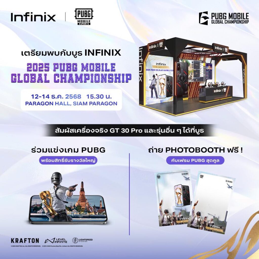 ร่วมรับชมการแข่งขันสุดเร้าใจของ PUBG MOBILE Global Championship 2025 และพบกับบูธอินฟินิกซ์ที่เปิดให้ผู้ร่วมงานได้มาสัมผัสและทดลองเล่นเกมแบบมือโปรกับ Infinix GT 30 พร้อมกิจกรรมภายในบูธ อาทิ การแข่งขัน PUBG เพื่อลุ้นรับรางวัลใหญ่ ร่วมถ่ายสุดประทับใจกับ Photo Booth พร้อมเฟรม PUBG สุดพิเศษ เตรียมตัวให้พร้อมแล้วพบกันได้ในวันที่ 12 -14 ธันวาคม 2568 ณ สยามพารากอนฮอลล์ หรือติดตามรายละเอียดการแข่งขันและกิจกรรมอื่น ๆ จากอินฟินิกซ์เพิ่มเติมได้ที่ https://www.facebook.com/InfinixMobileThailand/