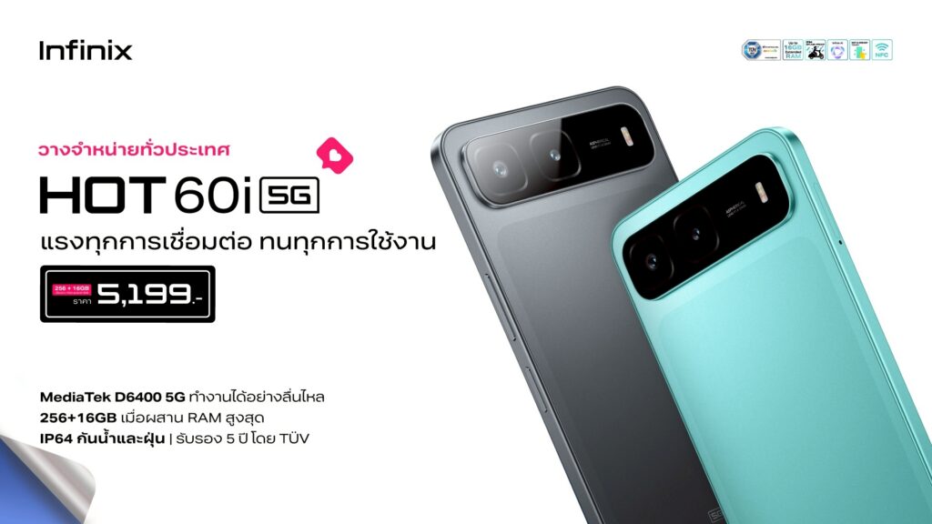 อีกหนึ่งจุดเด่นของ HOT 60i 5G คือความทนทานด้วยมาตรฐาน IP64 กันน้ำและกันฝุ่น ช่วยปกป้องตัวเครื่องจากการใช้งานในชีวิตประจำวันได้อย่างมั่นใจ ตัวเครื่องมาในดีไซน์ที่เรียบหรูและหน้าจอแสดงผล ขนาด 6.75 นิ้ว ความชัด HD+ 120Hz มอบภาพที่คมชัด สวยงาม รับชมวิดีโอหรือคอนเทนต์โซเชียลได้เต็มตา กล้องหลังความละเอียดสูง 50MP และกล้องหน้า 5MP มอบภาพถ่ายคมชัดทุกสภาพแสง ปลดล็อกประสบการณ์สมาร์ทโฟนที่ชาญฉลาดยิ่งขึ้นด้วย Infinix AI เพื่อให้ผู้ใช้ได้สัมผัสกับเทคโนโลยี AI ล้ำสมัยตลอดเวลา ด้วยฟีเจอร์ Ask Everything เพียงสัมผัสเดียวก็พร้อมตอบทุกคำถาม และยังสามารถสนุกกับการสร้างสรรค์ภาพถ่ายที่สมบูรณ์แบบด้วยฟีเจอร์ AI Eraser และ AI Extender และการเปลี่ยนภาพสเก็ตช์หรือคำพูดให้กลายเป็นงานศิลป์ได้อย่างง่ายดาย ให้ทุกชิ้นงานไม่ซ้ำใคร รวมถึงความสามารถใหม่ อย่าง Circle to Search ที่จะทำให้การค้นหาข้อมูลจากภาพเป็นเรื่องง่ายเพียงแค่การวงกลมในภาพหรือข้อมูลที่ต้องการ พร้อมระบบโอนข้อมูลด้วย NFC เพียงสัมผัสก็สามารถแชร์ไฟล์ระหว่างสมาร์ทโฟนอินฟินิกซ์กับอุปกรณ์ใกล้เคียงได้ทันทีด้วยความเร็วแรง เพื่อการสื่อสารที่ทรงพลังและง่ายดาย HOT 60i 5G จึงเป็นตัวเลือกที่ชาญฉลาดสำหรับผู้ที่มองหาสมาร์ทโฟนที่ตอบโจทย์ทั้งราคา ประสิทธิภาพ และความทนทาน โดยมี 2 สีสันให้เลือกได้แก่ Sleek Black (ดำ) และ Monsoon Green (เขียว) ในราคาสุดคุ้มเพียง 5,199 บาท เท่านั้น