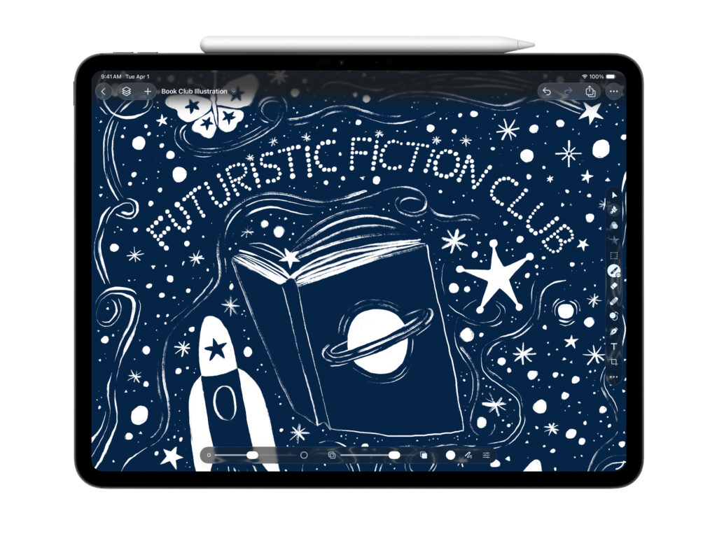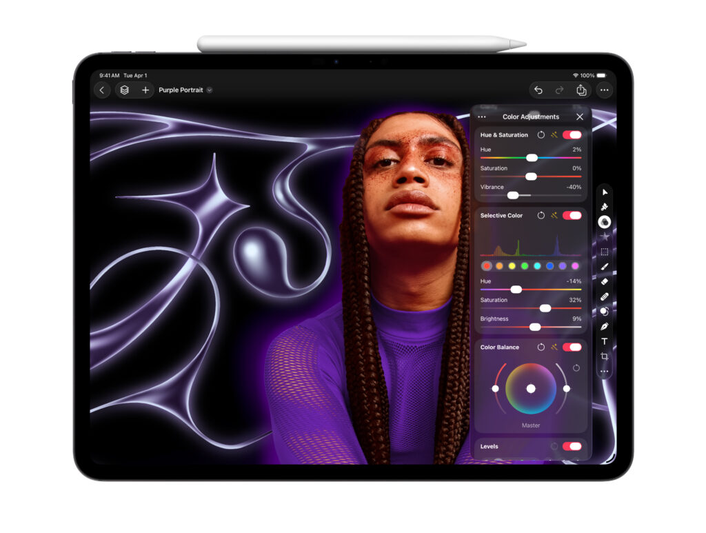 การควบคุมด้วยระบบสัมผัสที่เป็นธรรมชาติช่วยให้การสร้างสรรค์งานออกแบบระดับเดสก์ท็อปกลายเป็นเรื่องง่ายยิ่งขึ้นไม่ว่าจะพก iPad ไปที่ไหน แถบ Layers ด้านข้างที่มีคุณสมบัติครบครันช่วยให้ครีเอเตอร์สามารถสร้างงานออกแบบโดยใช้องค์ประกอบที่โดดเด่นไม่เหมือนใครหลายประเภท อย่างรูปภาพ รูปทรง ข้อความ หรือแม้แต่วิดีโอ ส่วนเครื่องมือสำหรับการเลือกที่ชาญฉลาดก็ช่วยให้ผู้ใช้แยกบางส่วนของภาพออกมาปรับแต่งได้ง่ายๆ และยิ่งสามารถมาสก์ได้ละเอียดทั้งบิตแมปและเวคเตอร์ ผู้ใช้จึงสามารถซ่อนหรือแสดงส่วนใดส่วนหนึ่งของงานออกแบบได้อย่างเฉพาะเจาะจง นอกจากนี้การที่ฮาร์ดแวร์ ซอฟต์แวร์ และ Apple Silicon ผสานการทำงานเป็นหนึ่งเดียวยังเป็นการปลดล็อคคุณสมบัติอย่าง Super Resolution ที่อัปสเกลภาพได้อย่างชาญฉลาด, Deband ที่ช่วยลบความผิดเพี้ยนจากการบีบอัด และ Auto Crop ที่จะแนะนำการจัดองค์ประกอบภาพโดยอัตโนมัติ อีกทั้งยังรองรับ Apple Pencil เต็มรูปแบบ ศิลปินดิจิทัลจึงสามารถสนุกกับการวาดภาพและลงสีในแบบที่เป็นธรรมชาติที่สุดด้วยคอลเลกชั่นแปรงสวยงามที่ไวต่อแรงกด และเมื่อรวมกับความแม่นยำของ Apple Pencil ที่ยากจะหาใครเทียบ รวมถึงคุณสมบัติอย่างการยกปลาย9 การบีบ10 และการแตะสองครั้ง11 ด้วยแล้ว ครีเอเตอร์จึงสามารถรังสรรค์งานออกแบบที่พิถีพิถันถึงระดับพิกเซลได้