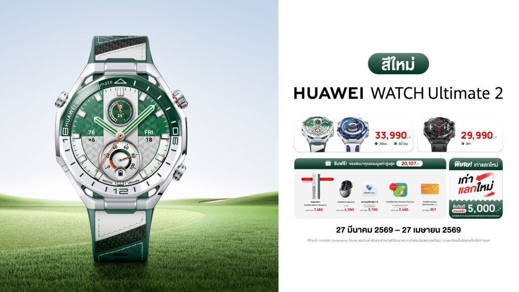 HUAWEI WATCH Ultimate 2 วางจำหน่ายในสีเขียว (สีใหม่) และสีน้ำเงิน ในราคา 33,990 บาท ส่วนสีดำ ราคา 29,990 บาท พิเศษเมื่อสั่งซื้อระหว่างวันที่ 27 มีนาคม 2569 – 27 เมษายน 2569 รับฟรี! ของสมนาคุณรวมมูลค่าสูงสุด 20,107 บาท