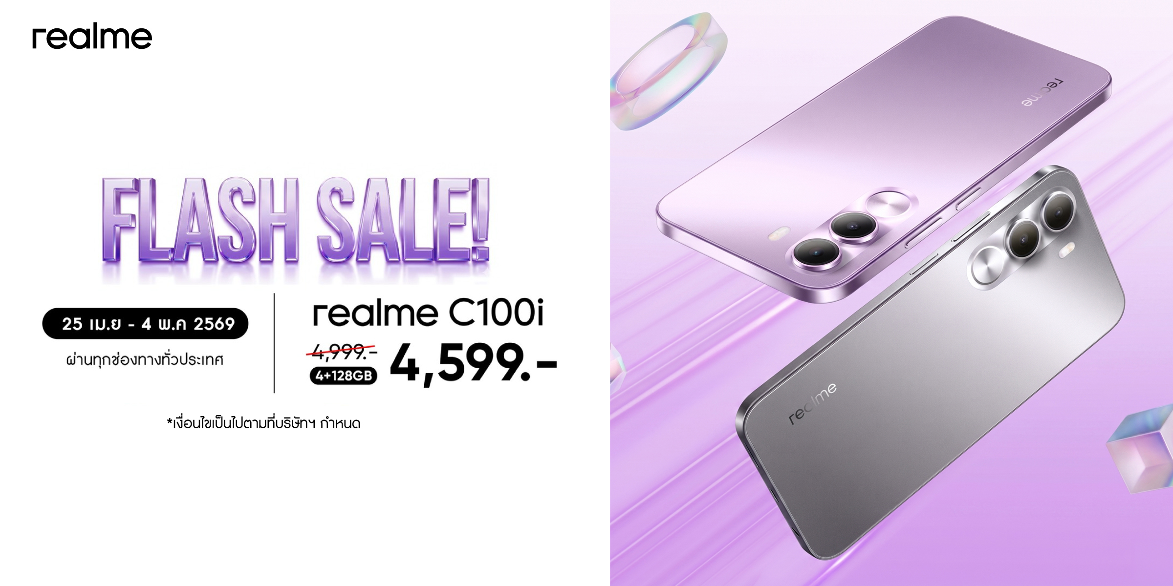 กรุงเทพฯ 23 เมษายน 2569 –ซัมเมอร์นี้ถ้ายังหาสมาร์ตโฟนคู่ใจสายลุยไม่ได้ บอกเลยว่าดีลนี้ห้ามพลาด! realme (เรียลมี) จัดโปรโมชัน “FLASH SALE” แบบจัดเต็ม ส่ง realme C100i บัดเจ็ตโฟนสุดอึด ความจุ 4/128GB ที่ออกแบบมาเพื่อการใช้งานหนักโดยเฉพาะ ทั้งทนทาน แบตอึด พร้อมลุยได้ทุกสถานการณ์ ไม่ว่าจะฝุ่น ลม หรือแดดแรง มาพร้อมส่วนลดสูงสุด 400 บาท เหลือเพียง 4,599 บาทเท่านั้น คุ้มค่าเกินราคาแบบนี้หาไม่ได้ง่าย ๆ โปรแรงนี้เริ่มตั้งแต่วันที่ 25 เมษายน ถึง 4 พฤษภาคม เหมาะสุด ๆ สำหรับคนทำงานกลางแจ้ง หรือสายแอดเวนเจอร์ที่ต้องการมือถือไว้ใช้งานจริงจังทุกวัน
