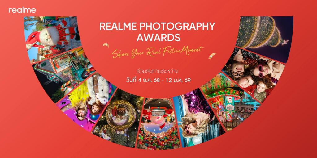 กรุงเทพฯ 4 ธันวาคม 2568 – realme (เรียลมี) แบรนด์สมาร์ตโฟนเพื่อคนรุ่นใหม่ที่เติบโตเร็วที่สุดในโลก กลับมาสร้างแรงสั่นสะเทือนครั้งใหญ่ให้วงการไลฟ์สไตล์ดิจิทัลอีกครั้ง ด้วยการเปิดตัวแคมเปญถ่ายภาพระดับ สากล  “realme Photography Awards“ ภายใต้คอนเซป “SHARE YOUR REAL MOMENT” ที่ชวนผู้ใช้ realme ทั่วโลก รวมถึงชาวไทย มาร่วมปล่อยพลังครีเอทีฟ เก็บโมเมนต์ที่เป็น “ตัวตนจริงของคุณ” ผ่านการประกวดภาพถ่ายออนไลน์สุดยิ่งใหญ่ ที่เปิดพื้นที่ให้ทุกคนได้เล่าเรื่องในแบบของตัวเองอย่างอิสระ พร้อมเติมความสนุกให้เดือดกว่าเดิมด้วยกิจกรรม พิเศษ “Real Festive Moments” บนเพจเฟซบุ๊ก realme Thailand ที่ให้แฟน ๆ ได้ฉลองโมเมนต์ดี ๆ ในช่วงเทศกาลส่งท้ายปีของแห่งความสุขแบบมีสไตล์ และเปล่งประกายในแบบที่เป็นคุณที่สุด